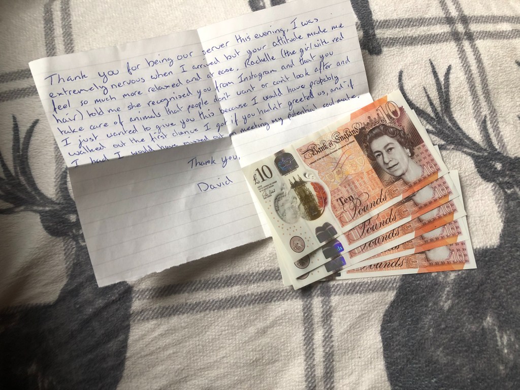 Thank you for being our server this evening, I was extremely nervous when I arrived but your attitude made me feel so much more relaxed and at ease. Rachelle (the girl with red hair) told me she recognized you from Instagram and that you take care of animals that people don’t want or can’t look after and I just wanted to give you this because I would have probably walked out the first chance I got if you hadn’t greeted us, and if I had I would have missed out on meeting my potential soul mate.